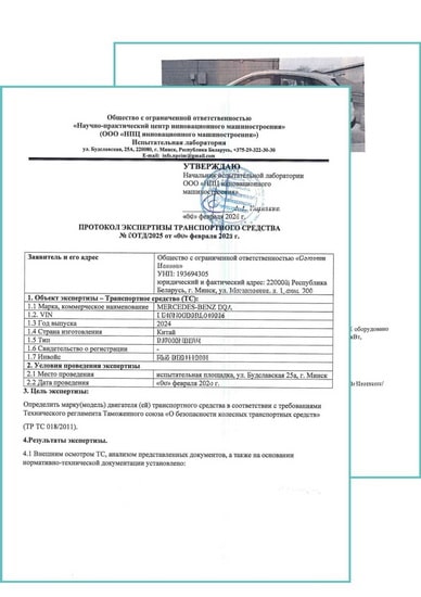 Белорусская аккредитованная испытательная лаборатория ООО "НПЦ инновационного машиностроения" осуществляет оперативную подготовку всей необходимой документации, связанной с подтверждением типа двигателя, трансмиссии, кузова либо категории транспортного средства, включая представления заявителю протокола технической экспертизы транспортного средства или соответствующего заключения.