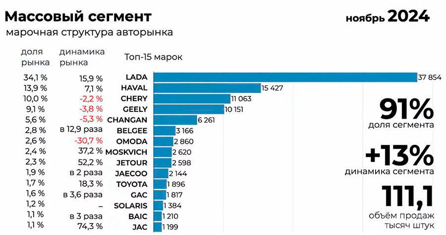 Белорусский производитель BELGEE потихоньку завоевывает и рынок России. В ноябре 2024 года восточным соседям продали 3166 новых автомобилей, что составляет 2,8% всего рынка России.